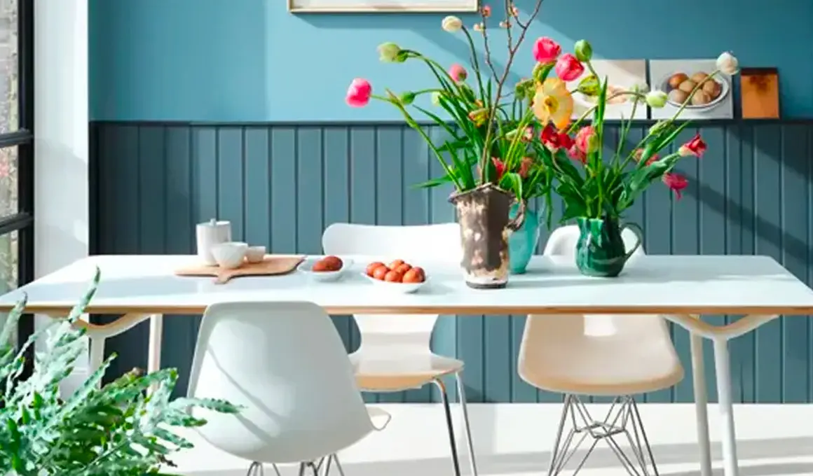 Enfin, une déco moderne en bleu, vert et blanc dans la salle à manger apporte une touche fraîche et contemporaine à cet espace convivial. Le bleu, dans ses nuances élégantes, crée une atmosphère apaisante, tandis que le vert insuffle une note naturelle et vivifiante. Le blanc, en fond neutre, illumine la pièce et met en valeur les autres couleurs. Cette combinaison moderne et dynamique transforme la salle à manger en un lieu lumineux, équilibré et parfait pour partager des repas dans une ambiance à la fois moderne et accueillante.