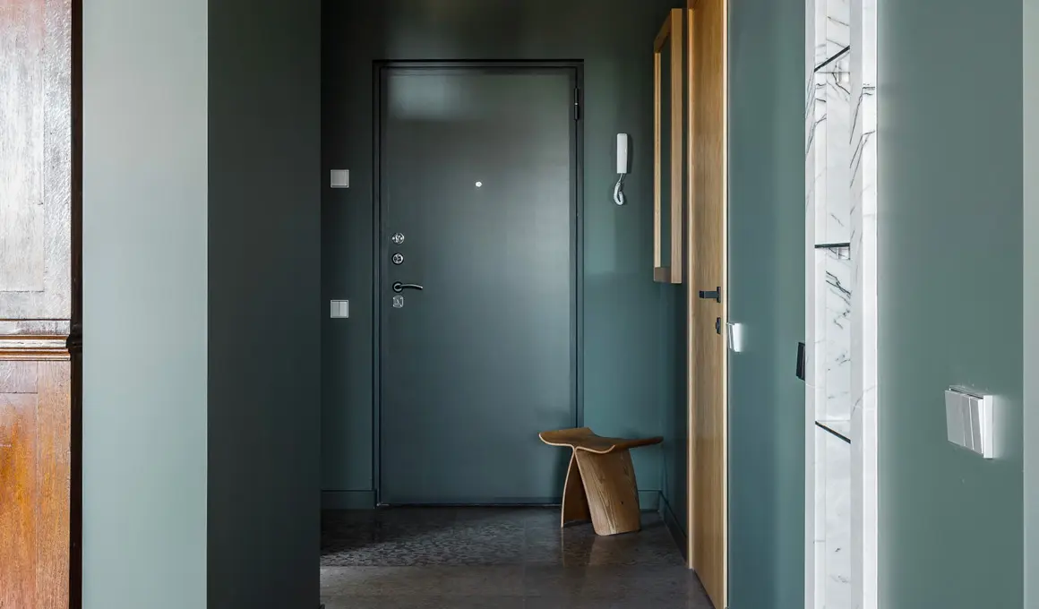 Ensuite, si vous avez envie d’apporter une touche élégante et apaisante, le vert kaki dans le couloir est un excellent choix. Cette teinte subtile et naturelle crée une atmosphère sereine tout en ajoutant du caractère à cet espace souvent négligé. Peignez les murs en vert kaki et associez-les à des matériaux comme le bois ou des accessoires en métal noir pour un contraste moderne. Des miroirs aux cadres dorés ou des éclairages discrets peuvent compléter l’ensemble, donnant à votre couloir une allure chic et accueillante.