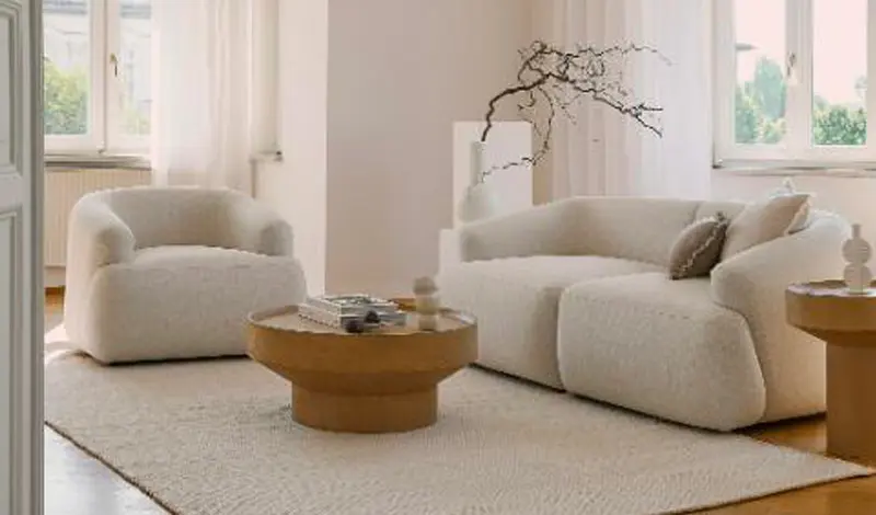 1. Suspension minimaliste noire chez Maisons du Monde | 2. Canapé arrondi tissu bouclette blanc chez La Redoute | 3. Table basse noire minimaliste chez AM PM
