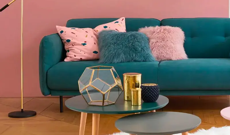 Je vous propose de découvrir comment associer le bleu canard et le rose dans votre salon ci-dessous ! Vous verrez, ce duo apporte une vraie élégance à la pièce.