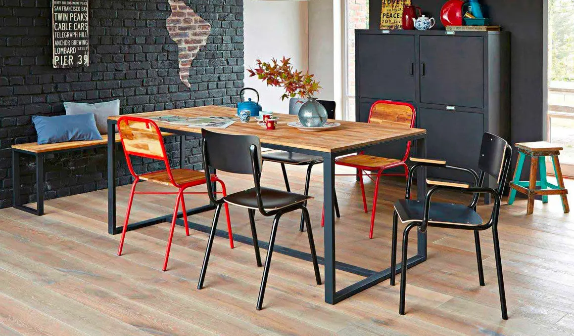 Ensuite, une salle à manger vintage autour du métal permet de prolonger cette ambiance rétro avec caractère et originalité. Des chaises en métal vieilli, une table en bois massif aux pieds en acier ou encore des suspensions industrielles créent un ensemble cohérent et plein de personnalité. Ce mélange de matériaux bruts donne du cachet à la pièce tout en restant chaleureux, surtout lorsqu’il est adouci par quelques touches de textile ou des objets déco chinés.