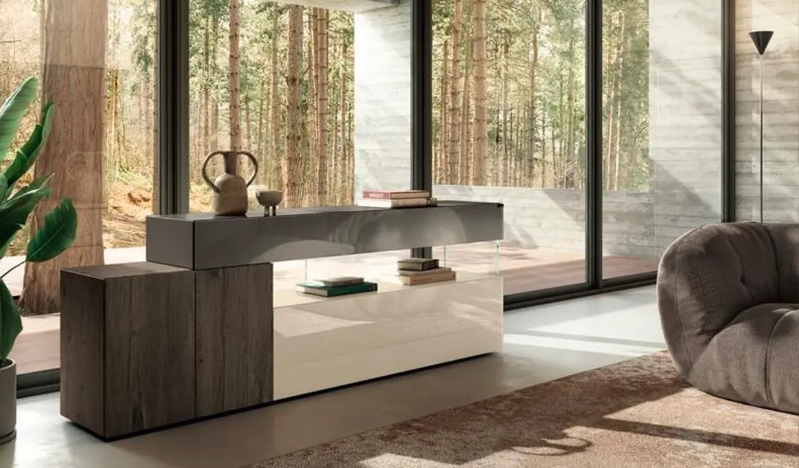 Le bois, quant à lui, apporte une chaleur naturelle et un contraste subtil avec la rigueur des lignes minimalistes. Utilisé dans les tables, les panneaux muraux ou dans un buffet salon moderne, il offre une dimension sensorielle unique, où chaque grain et chaque texture racontent une histoire.